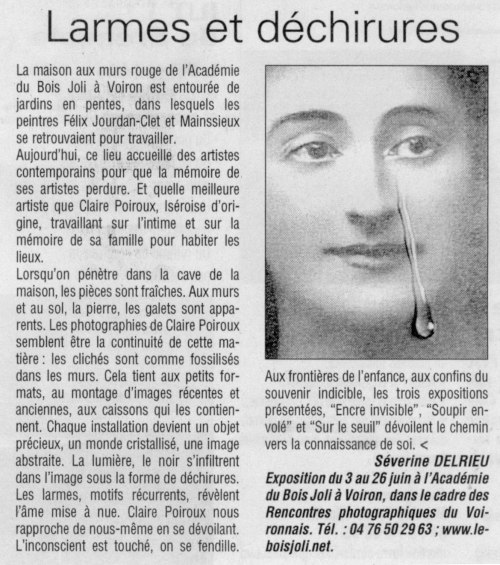 L’infinie délicatesse avec laquelle Claire Poiroux élabore chacune de ses photos témoigne de la fragilité des êtres, de cette grâce fluette qu’est la vie. Les objets les plus modestes, les plus dépourvus de prestige, elle les investit de ses émois intérieurs. De l’art le plus voyeur qui soit, elle fait l’expression paradoxale de sa pudeur et de son intimité. »