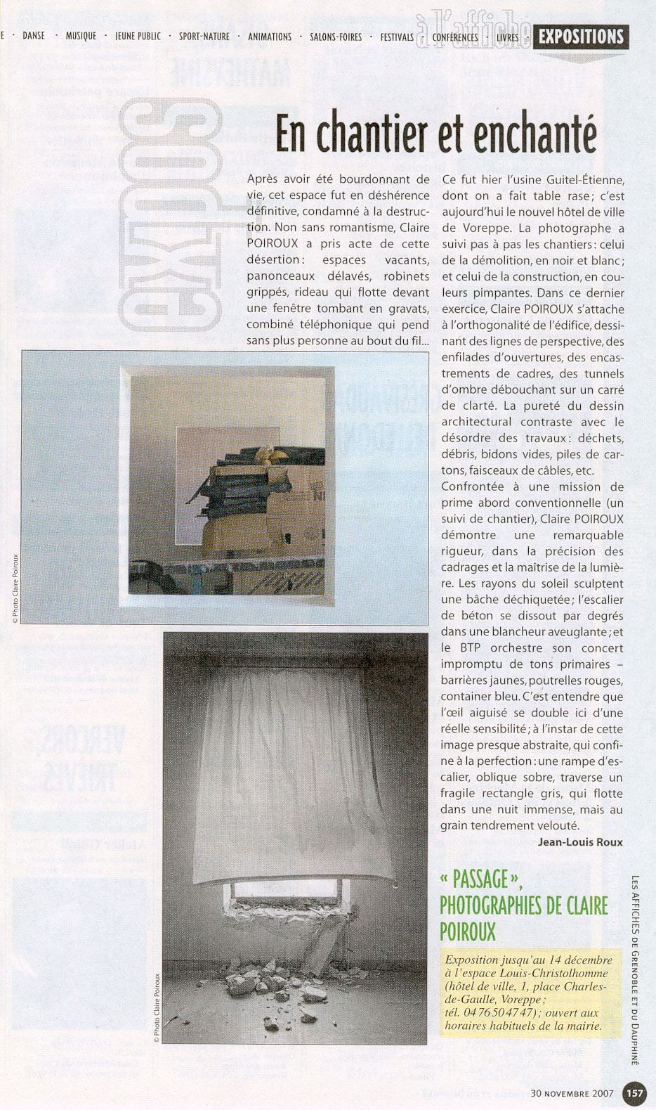 « Claire Poiroux, photographie ce qui passe « entre ». Ni passé, ni présent ; ni véritablement flou. Avec elle, même le vent porte une ombre. Surtout le vent. Que peu savent regarder et saisir. Elle en est. Qui le laisse pourtant filer. Le long des chemins. Des premières aux dernières lueurs.